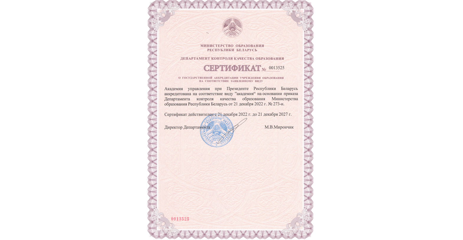 Лицензия на осуществление образовательной деятельности представлена Академии управления при Президенте Республики Беларусь Министерством образования Республики Беларусь. Решение о предоставлении лицензии от 29.04.2004 № 474 (решение об изменении лицензии от 20.03.2024 № 119).