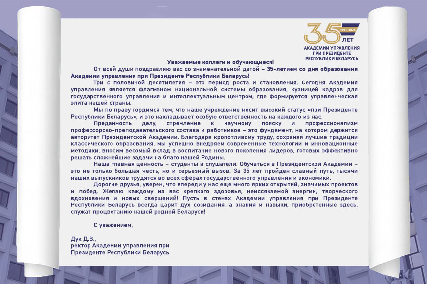 Поздравление ректора Академии управления при Президенте Республики Беларусь с 35-летием со дня основания