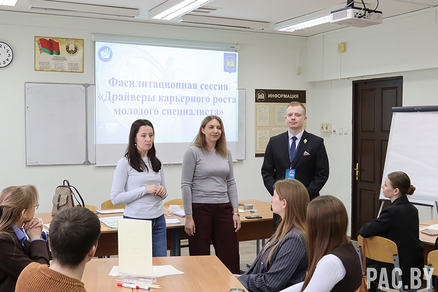 16 апреля 2026 года в рамках Недели специальности «Государственное управление и экономика» для студентов была организована фасилитационная сессия на тему «Драйверы карьерного роста молодого специалиста». Спикерами выступили начальник и главный специалист отдела обучения и развития персонала департамента развития персонала ОАО «Белинвестбанк» Зайцева Елена и Мацукевич Елена.