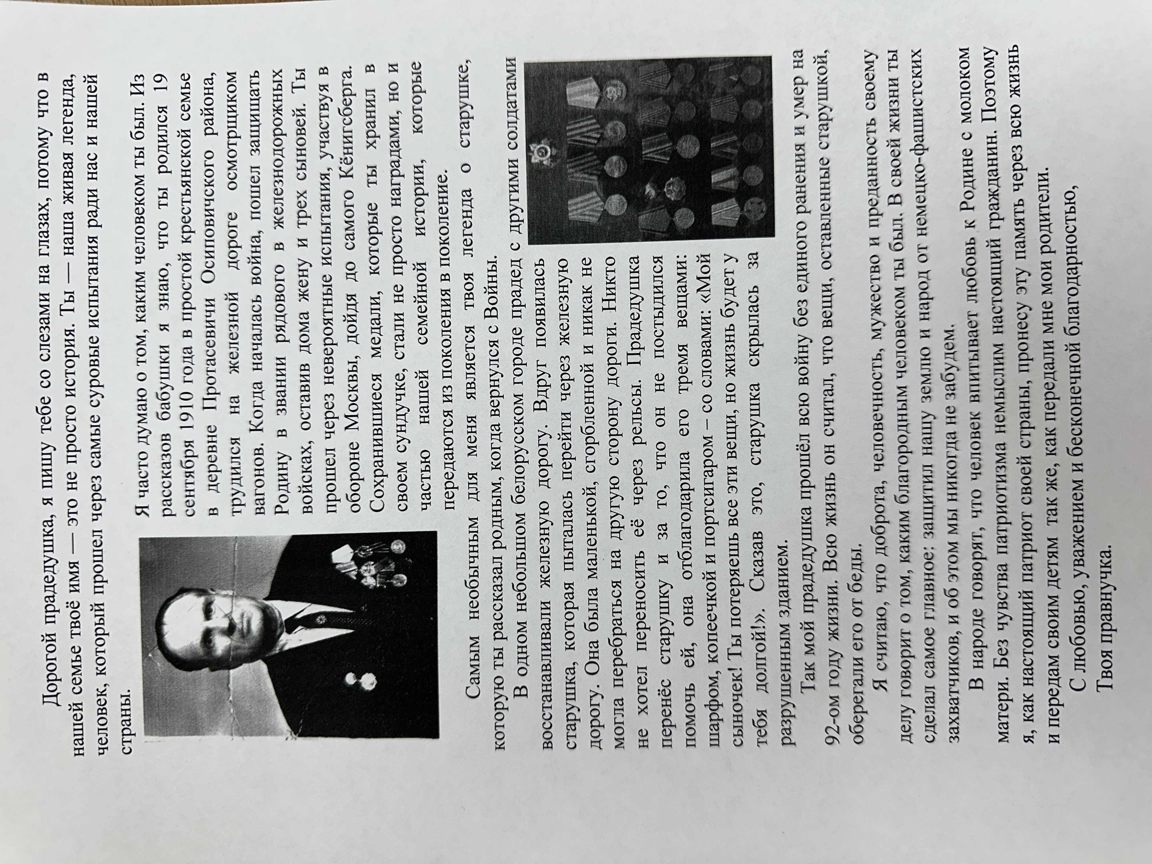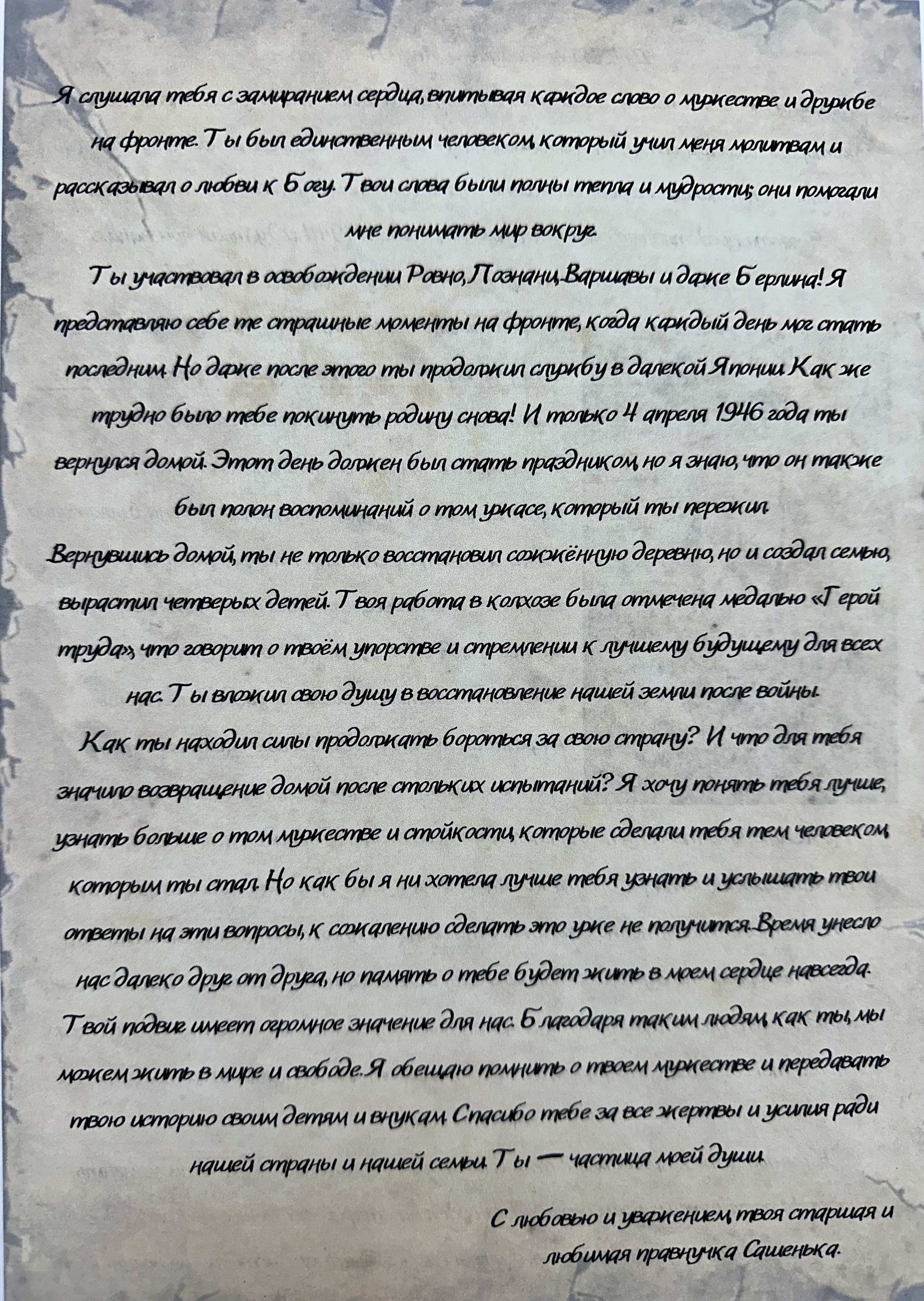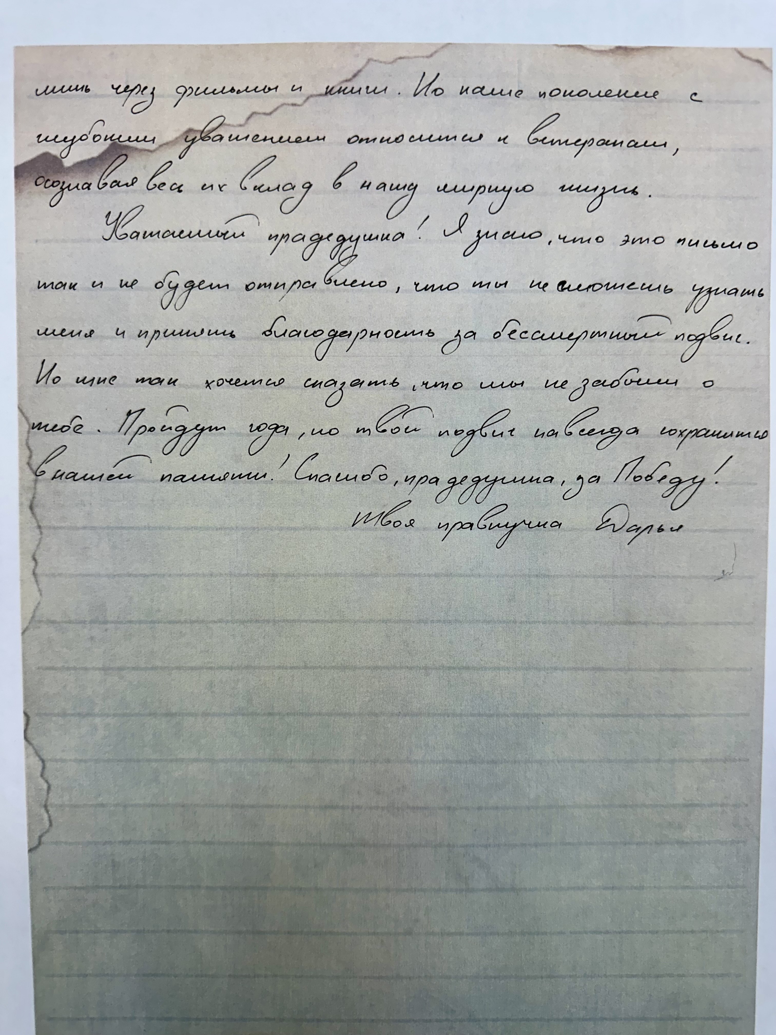 Совсем недавно в Президентской Академии прошел республиканский конкурс «Письмо прадеду», в рамках которого студенты писали письма-послания своим прадедам, участникам Великой Отечественной войны, выражая благодарность за мирное небо и размышляя о том, какой вклад современные молодые люди могут внести в развитие своей страны. Эти трогательные послания, наполненные гордостью и уважением к истории, – в нашем материале.