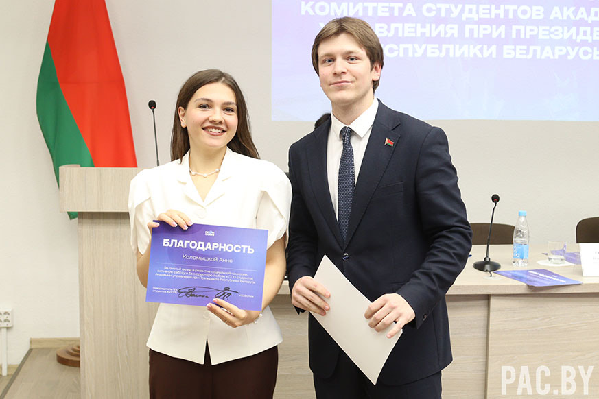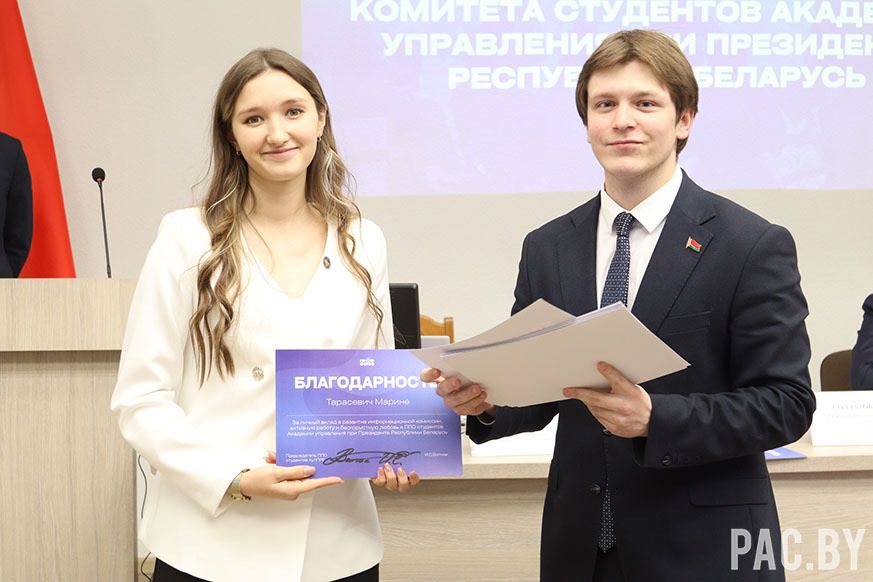 Также состоялась церемония награждения. Были вручены благодарности за личный вклад в развитие деятельности комиссий и первичной профсоюзной организации студентов Академии управления при Президенте Республики Беларусь.