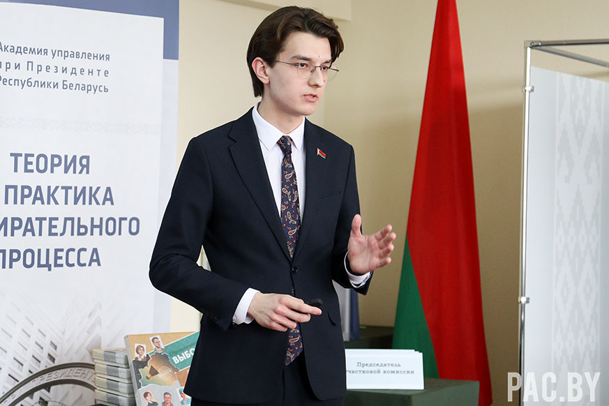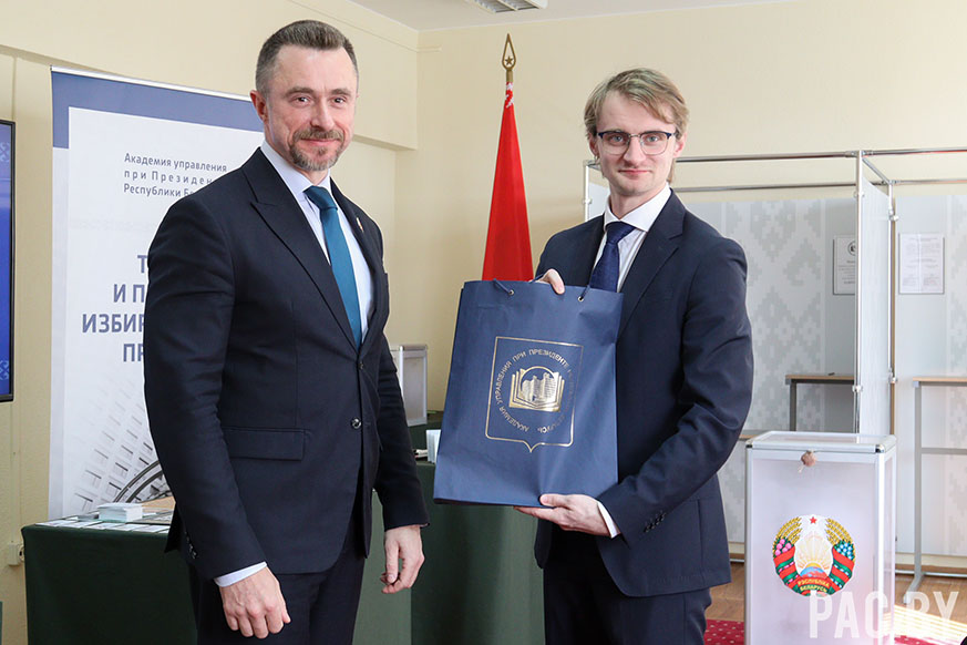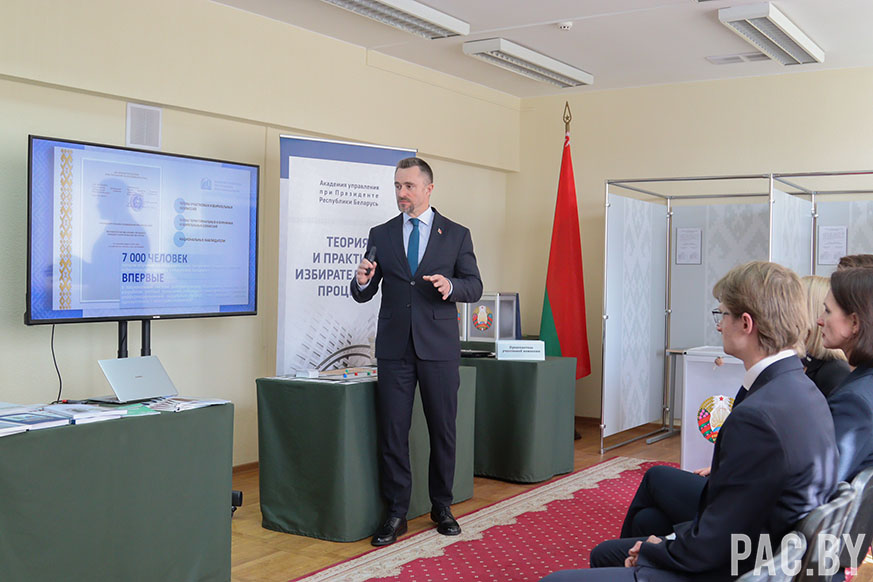 Делегация также посетила зал избирательного процесса Академии управления, где начальник Центра по работе с населением и избирательному процессу Андрей Беляков ознакомил гостей с деятельностью и проектами Центра.
