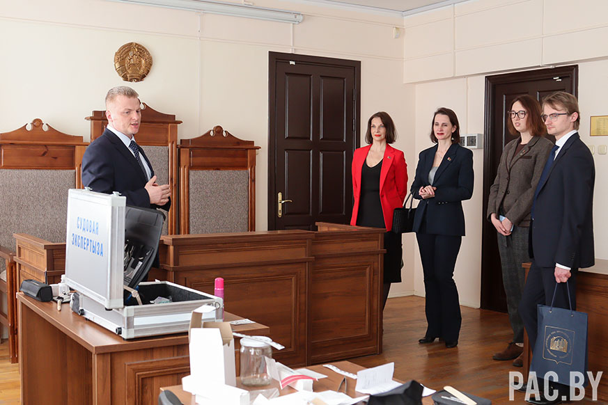 Затем доцент кафедры конституционного и административного права Евгений Стельмах провел экскурсию по учебному залу судебных заседаний.