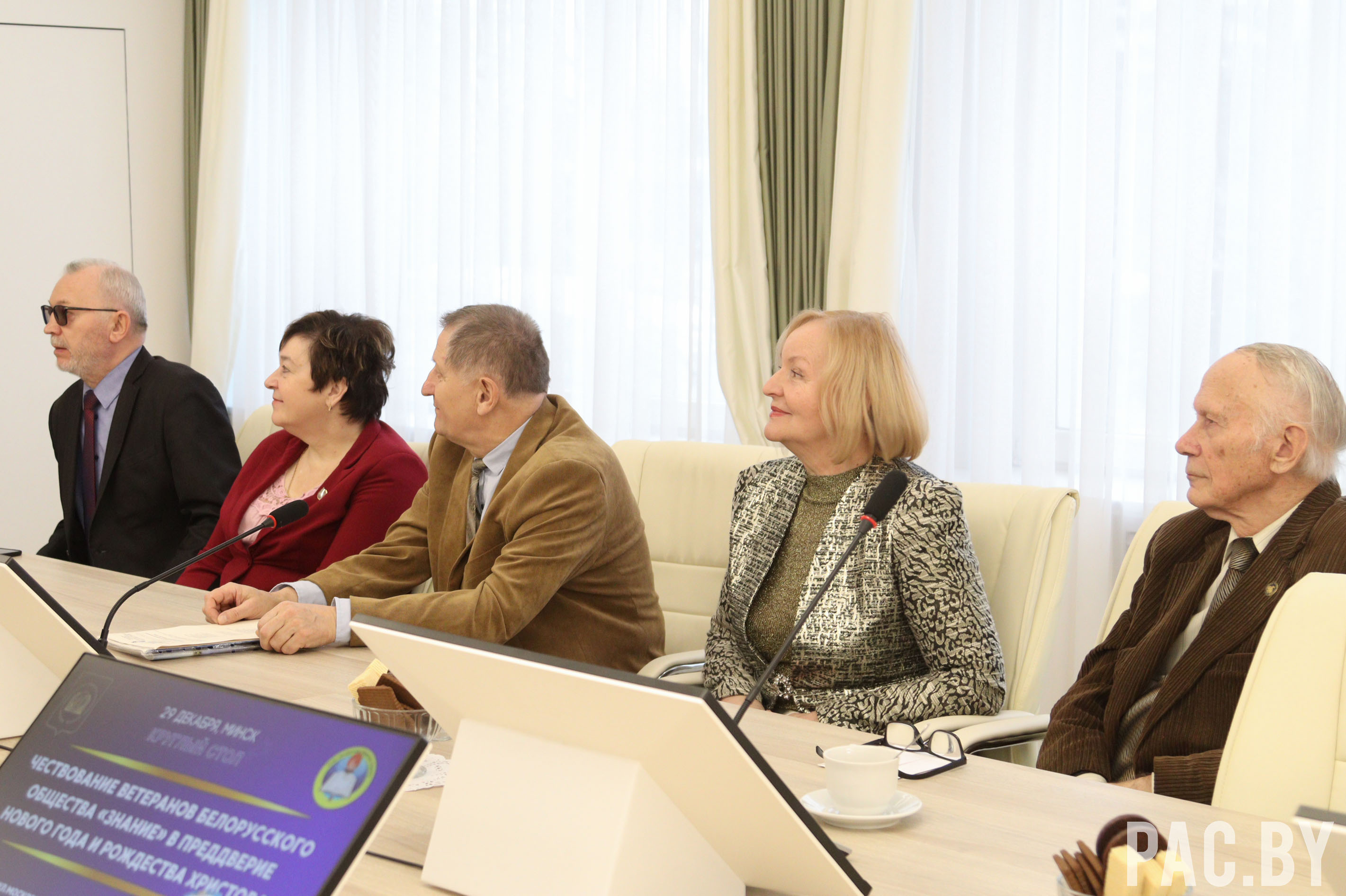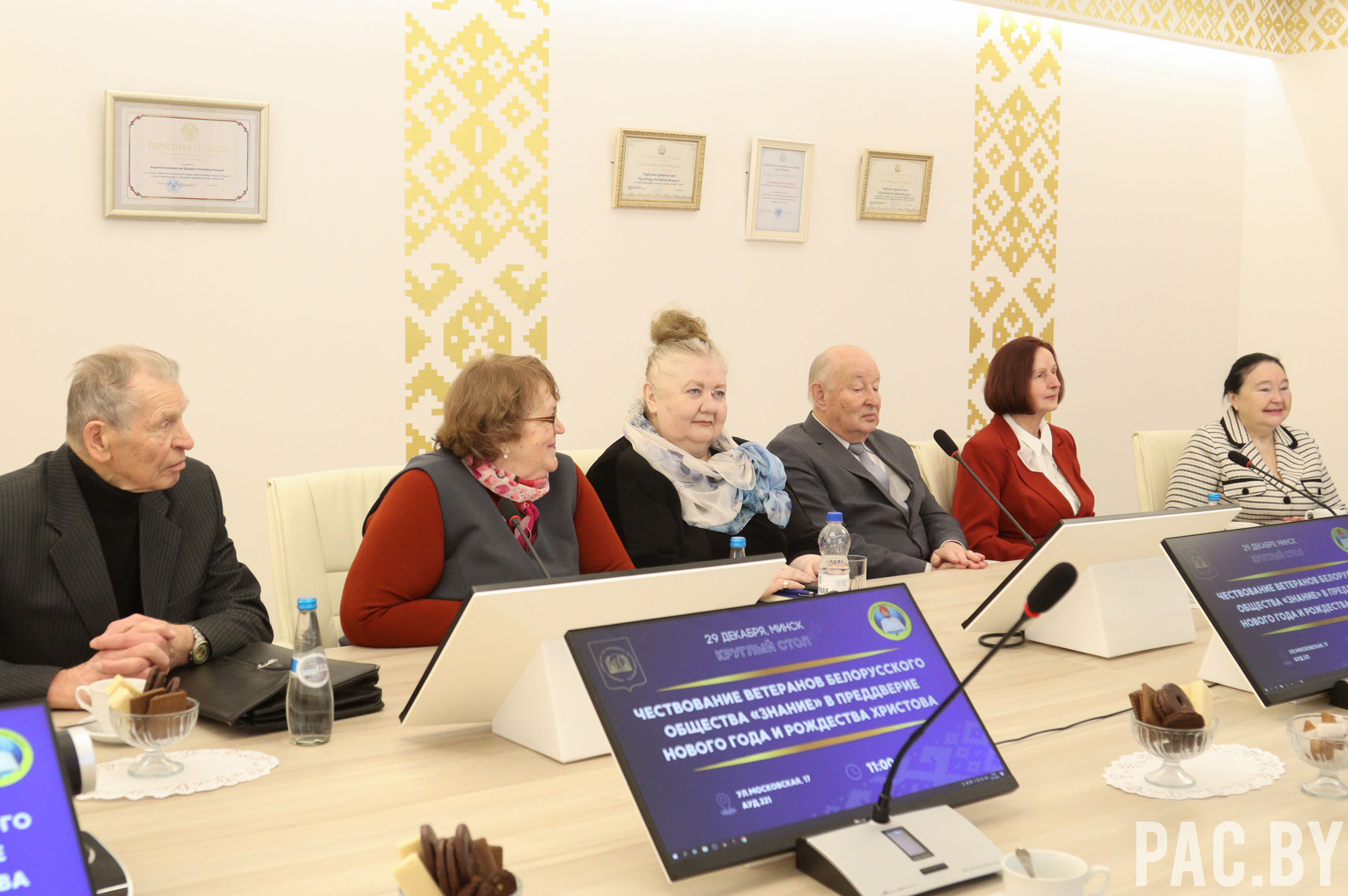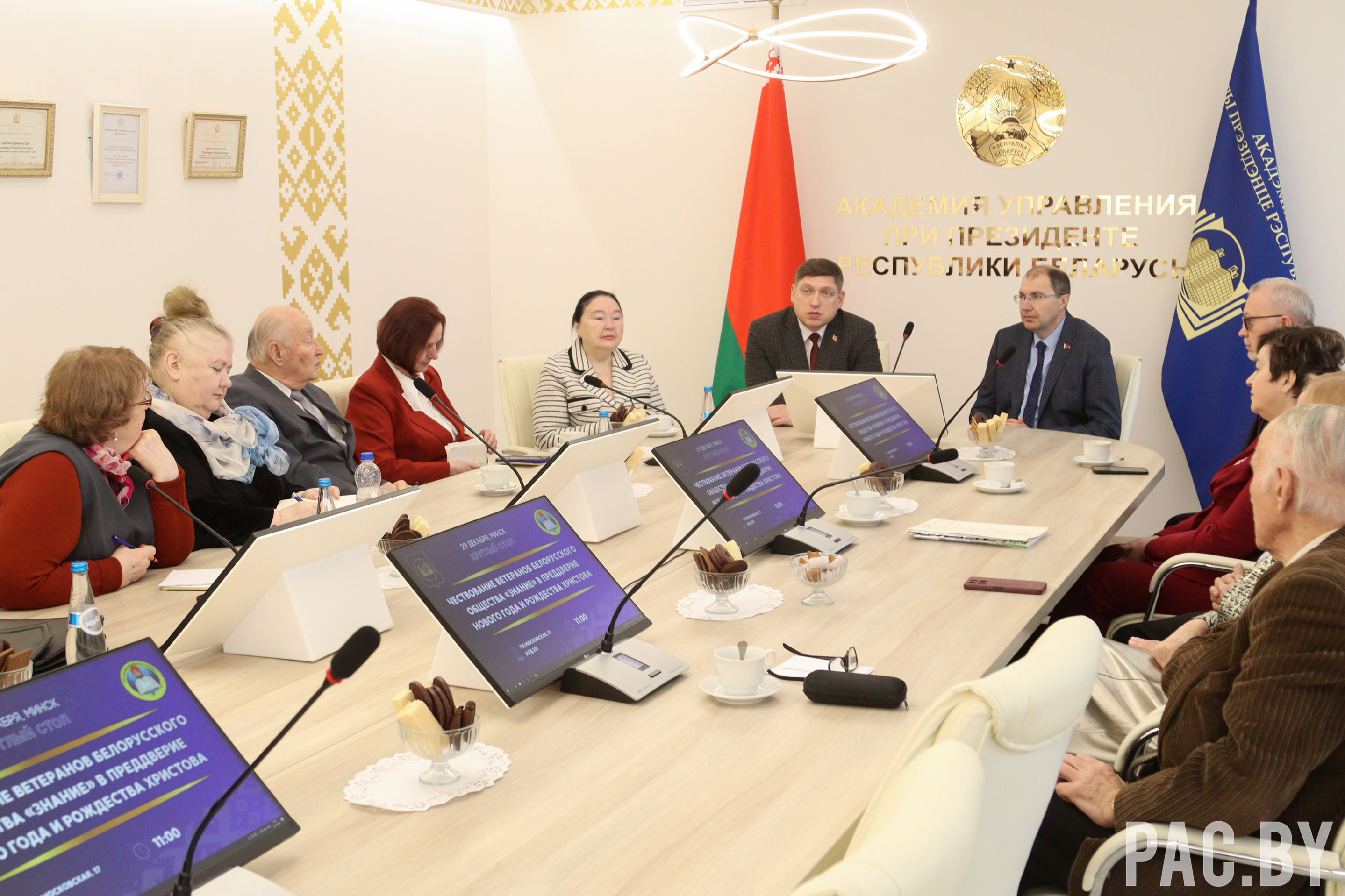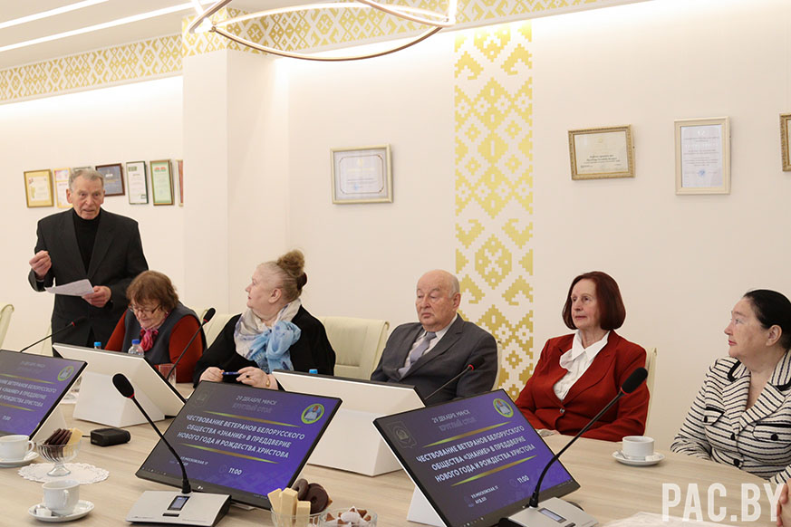 В преддверии Нового года и Рождества Христова прошло собрание руководящего состава Белорусского общества «Знание» в лице председателя правления Алексея Авдонина и заместителя председателя, ректора Президентской Академии Дениса Дука с заслуженными лекторами. Среди них – жители г. Минска и Минской области, которые трудятся с советских времен.