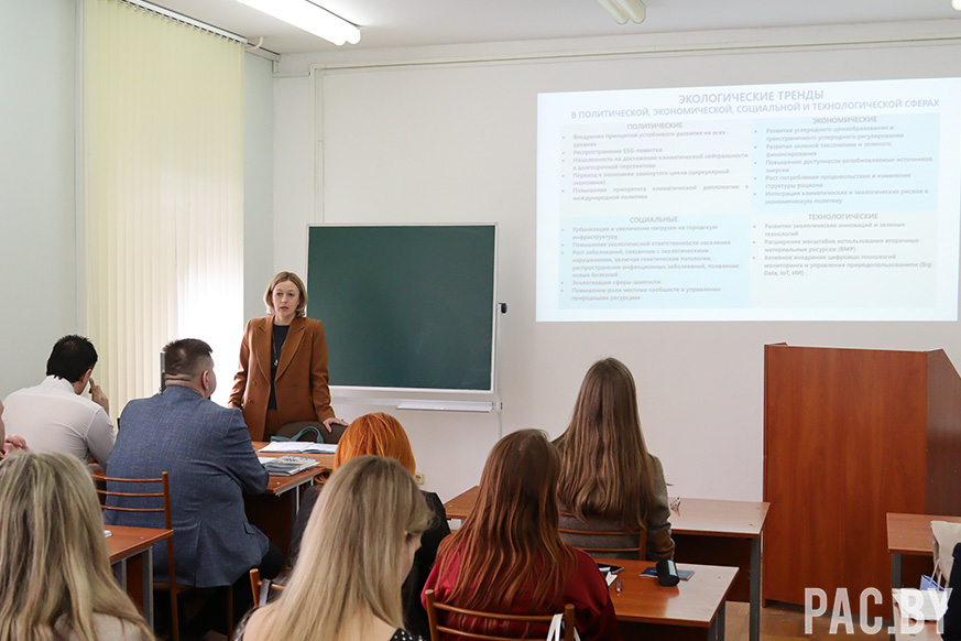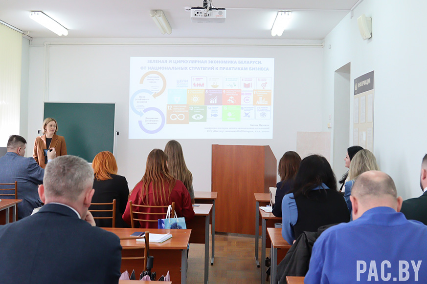 В рамках круглого стола по дисциплине «Государственная политика в сфере устойчивого развития Республики Беларусь» для слушателей 2 года обучения специальности «Государственное управление национальной экономикой» заведующая сектором эколого-экономических исследований ГНУ «Институт экономики НАН Беларуси» доцент Надежда Батова выступила с презентацией «Зеленая и циркулярная экономика Беларуси. От национальных стратегий к практикам бизнеса».